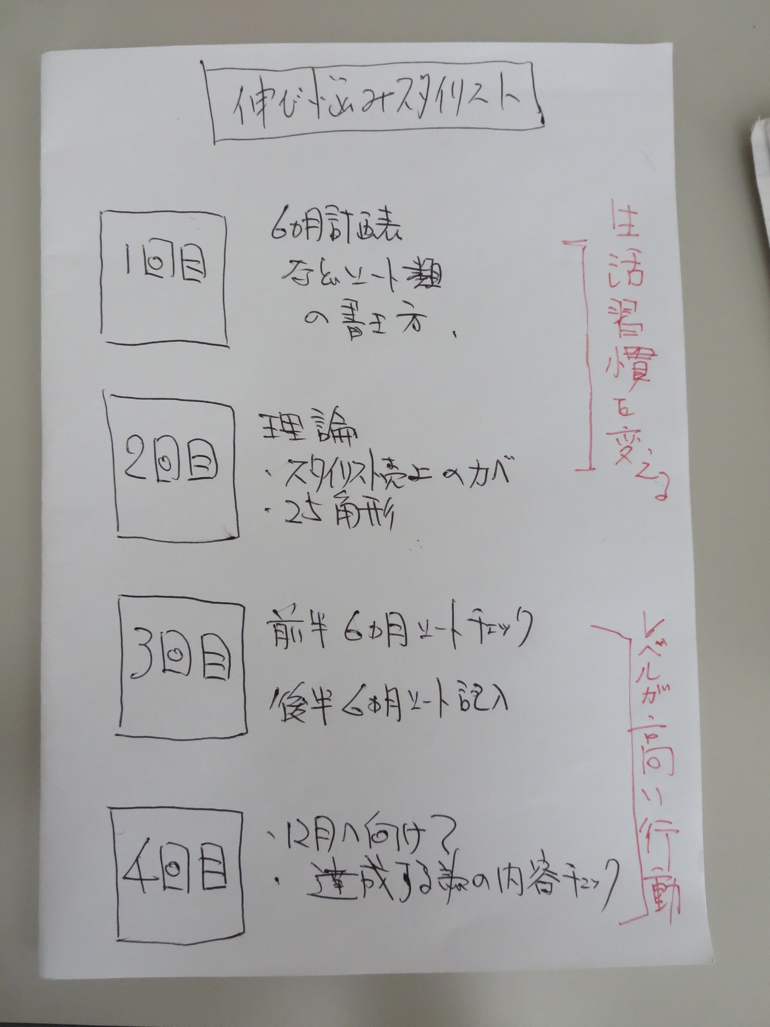 伸び悩みスタイリストの育成セミナーを始めて6年になる。2016年もBOB・東京・名古屋・大阪で行ったセミナーでは地域がらもあるがほぼ7割の伸び悩みが最高記録を更新した。あとの3割は宿題をやってこなかったり、行動しなかった人達だった。やはり行動しなければ結果は出ない。伸び悩みスタイリストの育成セミナーを始めた時はもう止めようかと思ったことがあった。受講態度が悪くダラダラで資料は忘れてくるし宿題もやってこない。ところが40人中3人の人達が100時間レッスンをやって来た。そのときにボクは腹を決めてこの3人の為だけにセミナーをやろうと決めた。そして伸び悩み本人以外に必ず店長かオーナーに一緒に参加してもらい宿題やシートの書き方を一緒に聞いてもらうことにした。そうすると結果が出始めた。今ではよほどやる気がない伸び悩み以外はだいたい結果が出せるようになってきた。ただそれには最低1年かかることが分かった。前半の半年では全員とラインでつながり毎日の方向をアップし「生活習慣をっ変える」後半の半年で過去の最高記録更新者の実例を全員で共有し「レベルが高い行動」をしてもらう。今年はBOB・名古屋・大阪・新潟・心の経営セミナーで行うことになった。ボクにとってこのセミナーの楽しみは12月31日に参加した人達から最高記録更新の感動的なレポートが届くことだ。いま昨年の最高記録更新者のレポートを整理しているが伸び悩みの皆さんの行動と努力に涙が出てくる。本当に皆さんよく頑張りました。