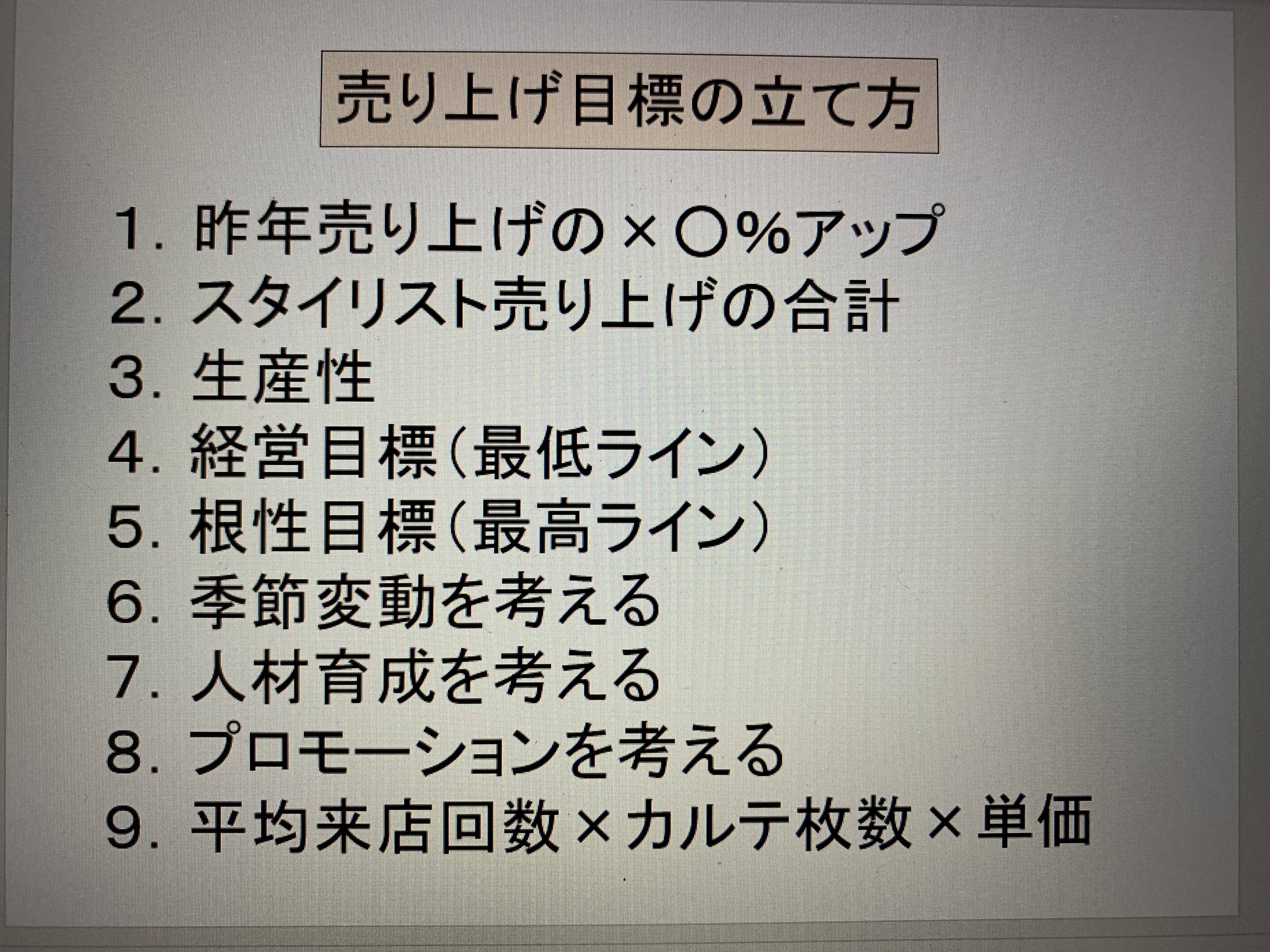 最初の頃は、このやり方で「考える習慣」を身に付ける為に3時間くらいかけて目標設定していました。最近は「数字は事前に考えてきました」というサロンが多く、実は「上が決めた数字を割り振り」しているだけでした。