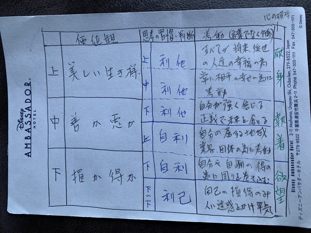 人の価値観と考動(言葉ではなく行動)をコンピテンシーモデル化して三段階で考える。日本の武士道の「美しい生き方」「善悪」「損得」の三段階。ここに仏教の「利他」「自利」「利己」を重ねてコンピテンシーモデルを作ってみると、その人間の価値観と判断... -
